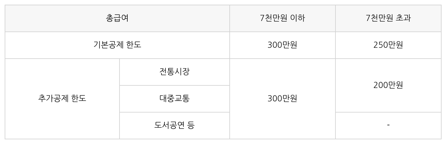 더불어 올해는 공제율이 일시적으로 변경된 항목들이 있습니다 문화비에 영화관람비가 추가되고(7.1이후) 공제율도 40%로 상향되었습니다(4.1~12.31) 전통시장과 대중교통 사용분 공제율이 각각50%, 80%까지 올랐다는 점도 달라졌습니다.